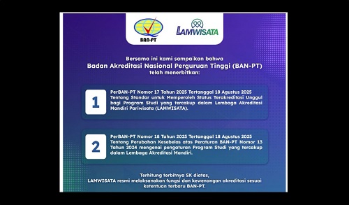 Lokapalanews.id | Jakarta – Terbitnya Peraturan BAN-PT Nomor 18 Tahun 2025 menjadi penanda berakhirnya sebuah era dan dimulainya babak baru yang lebih menjanjikan bagi pendidikan tinggi pariwisata di Indonesia. Dengan lahirnya Lembaga Akreditasi Mandiri Pariwisata (LAMWISATA), tongkat estafet akreditasi kini beralih dari BAN-PT ke tangan entitas yang lebih terfokus.
