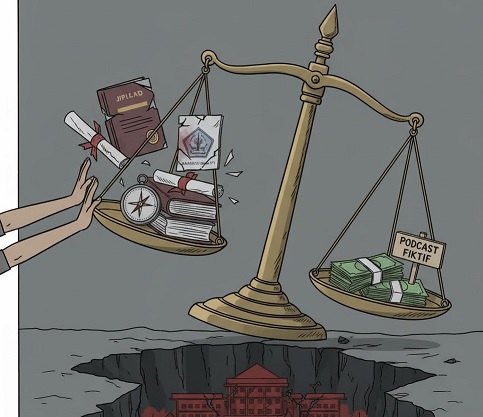 Ini kan namanya dagelan. Di satu sisi, kampus berusaha tampil modern, ingin punya ruang keren untuk bicara. Di sisi lain, cara mendapatkan uangnya justru kuno, sangat antik. Memakai proyek fiktif untuk mengamankan anggaran.
