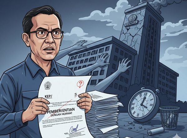 Saya menemukan banyak sekali “keseleo” administratif dalam surat pemecatan itu. Pertama, soal ketidaktelitian yang fatal. Di satu bagian tertulis mencabut SK tahun 2023, tapi di bagian lain merujuk ke tahun 2025. Ini bukan sekadar salah ketik, ini menunjukkan betapa terburu-burunya mereka ingin “menyingkirkan” seseorang sampai lupa memeriksa angka.