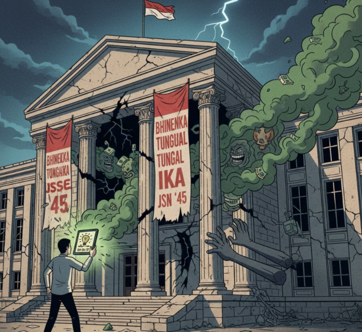 Sebuah gedung megah dengan pilar-pilar besar yang retak di bagian fondasinya, menggambarkan betapa rapuhnya sebuah institusi yang hanya besar di jargon tapi keropos di integritas.