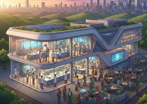 Ilustrasi gedung sekolah modern yang memadukan fasilitas laboratorium sains canggih dan ruang diskusi terbuka, mencerminkan visi SMA Unggul Garuda sebagai pusat keunggulan intelektual dan inklusivitas sosial bagi generasi muda Indonesia.