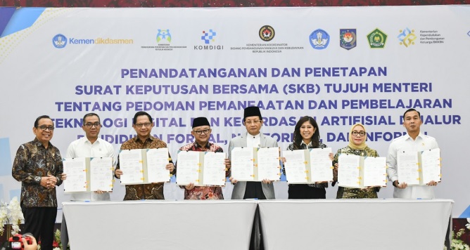 Surat Keputusan Bersama ini ditandatangani oleh tujuh pimpinan kementerian, yakni Menko PMK Pratikno, Menkomdigi Meutya Hafid, Mendiktisaintek Brian Yuliarto, Mendikdasmen Abdul Mu’ti, Menteri PPPA Arifah Choiri Fauzi, Menteri Kependudukan dan Pembangunan Keluarga Wihaji, serta Menteri Agama Nasaruddin Umar. Kolaborasi lintas sektor ini menjadi bukti keseriusan pemerintah dalam mengawal transformasi digital di jalur pendidikan formal, nonformal, maupun informal.