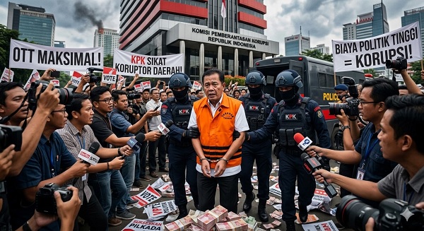 Ilustrasi seorang kepala daerah yang terjerat Operasi Tangkap Tangan (OTT) dikawal petugas KPK di tengah kepungan awak media dan tumpukan uang tunai yang menjadi simbol "biaya politik" yang mahal. Fenomena ini mencerminkan rapuhnya integritas pejabat publik ketika sistem kandidasi masih berbiaya tinggi dan pengawasan internal yang belum independen.